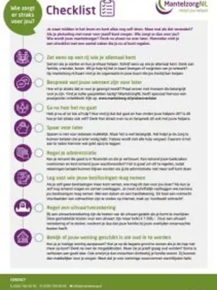 Je staat midden in het leven en kunt alles nog zelf doen. Maar wat als dat verandert? Als je plotseling niet meer voor jezelf kunt zorgen. Wie zorgt er dan voor jou? Wie wordt jouw mantelzorger? Denk nu alvast na over later. In deze checklist vind je een aantal zaken die je nu al kunt regelen.